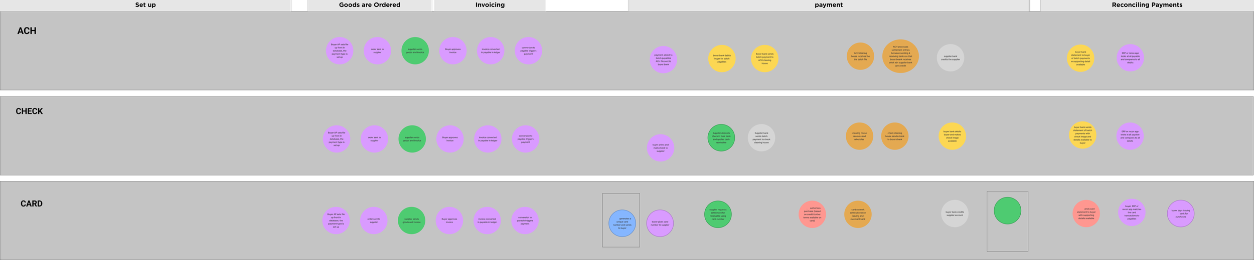 Interviews with accountants yeilded the insight that not all accounting software is created equal. Many platforms are still mostly manual, creating greater variation between department practices and more opportunities for error. Most significantly, many platforms do not yet have an option for virtual cards within payment types. Because accountants are forced to designate virtual cards as checks or ACH, necessary data may be lacking in file outputs transmitted to banks. Though accounting software is outside the bank’s sphere of influence, the information was new to the client and provided additional insight.