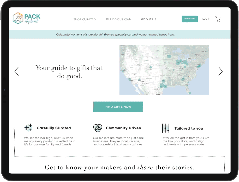 Pack Elephant’s business model was predicated on membership. Three levels of membership at different rates afford access to different features of the site. PE was envisioned itself first and foremost as BtoB targeting businesses with regular and robust gifting needs. As the pandemic shrank this niche (eliminating conferences and other key events), PE had to pivot to embrace the business to consumer pipeline.